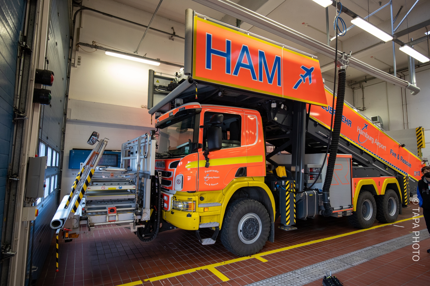 In the northern area of the airport, located between runway 15/33 and 05/23, is the fire station, which moved into it’s new building here in 2016. In terms of personnel, this fire brigade has around 88 employees and various emergency vehicles, including four airfield fire-fighting vehicles and a rescue stair truck. Also because of the Emirates Airbus A380, this is a category 10 airport fire station (highest category). It is very impressive to stand next to these large vehicles and we received a lot of information about them and about the topic airport fire brigades in gerneral. The pictures impressively show the large emergency vehicles.